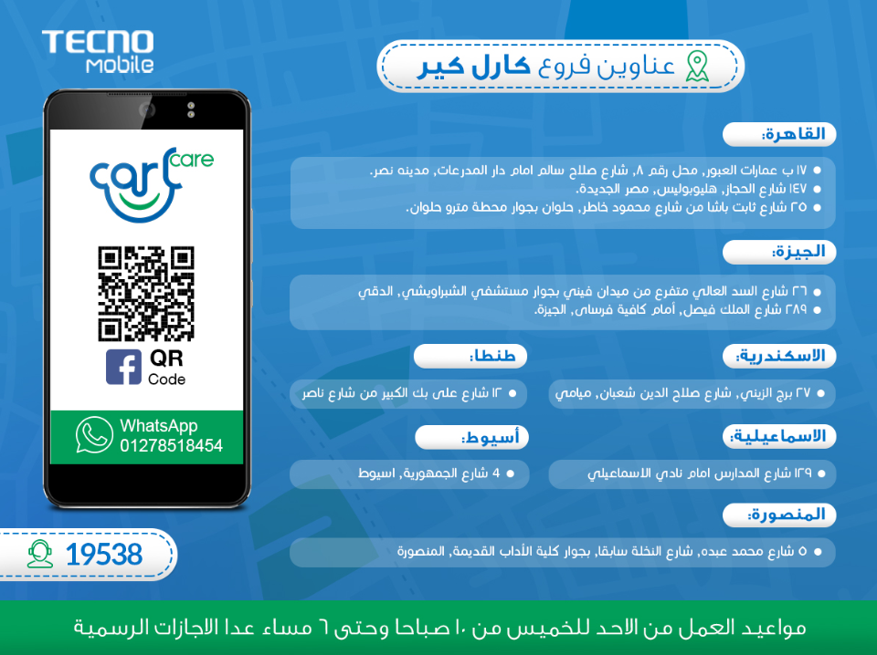 عناوين فروع صيانة شركة تكنو Tecno مع أرقام التليفونات لتوكيل كارلكير Carl Care فى مصر